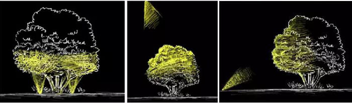 中高形喬木因樹形相對飽滿,在園林植物照明要根據其在景觀中所承擔的作用來選擇合適的照明手法。此類樹木一般高度大約在3-5米高的樹木,可根據樹木形狀燈具安裝與樹木正下方、離樹木3米左右距離或在樹木3米左右距離立杆裝燈向下照射樹木。